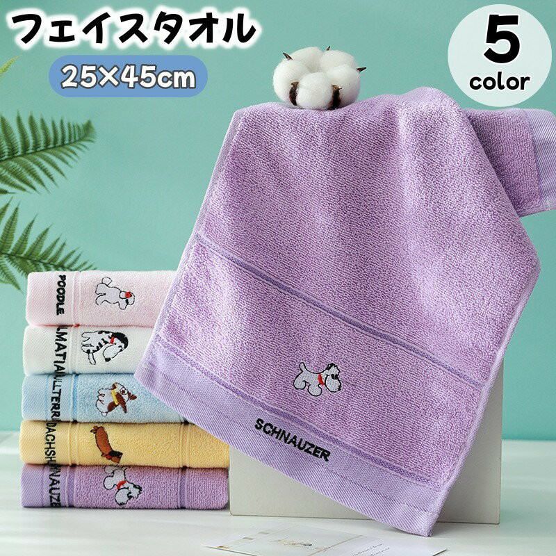 送料無料 フェイスタオル 25×45cm カラータオル ワンポイント刺繍 犬柄刺繍 かわいい 可愛い・・・