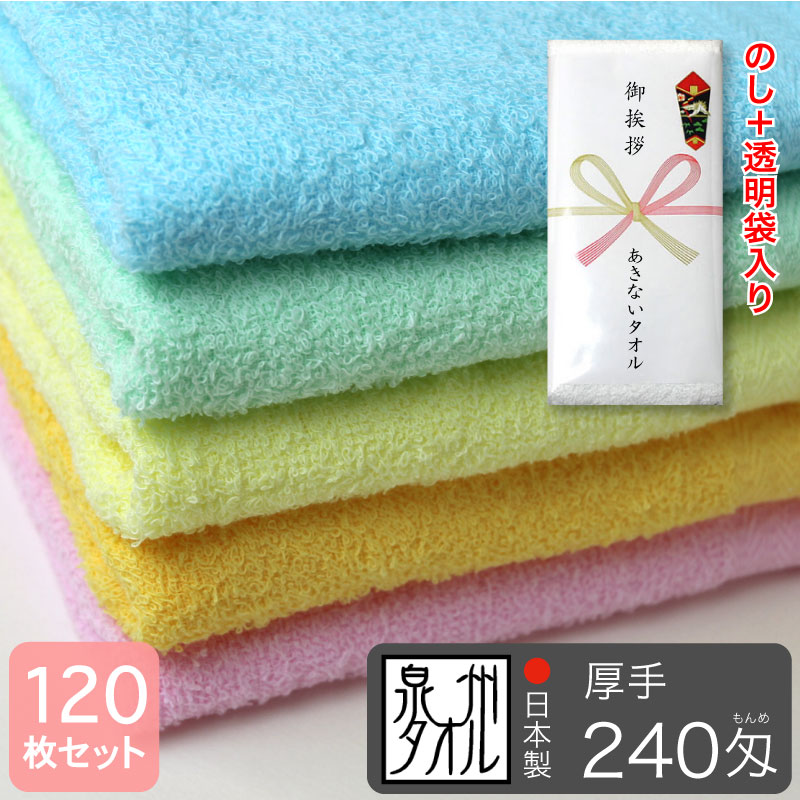 粗品タオル 日本製 総パイル カラータオル 厚手 240匁 120枚セット のし印刷 熨斗 袋入れ ・・・