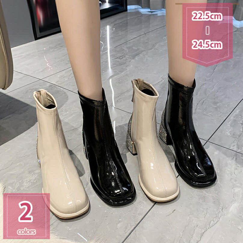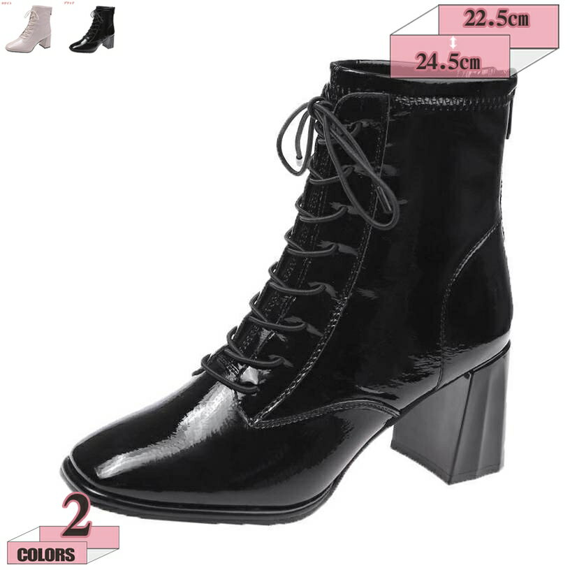 777円OFFクーポン エナメル スクエアトゥ ショートブーツ チャンキーヒール 5cm 歩きやすい・・・