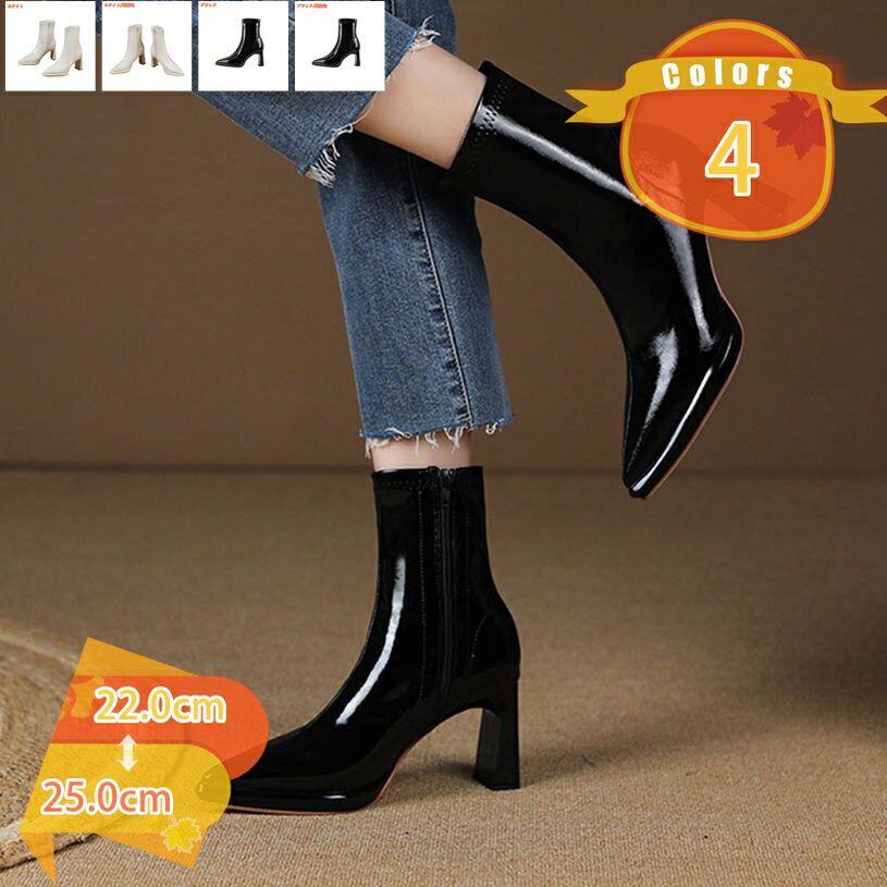 1000円OFFクーポン エナメル ブーツ レディース ショートブーツ 8cm 光沢 OL 太ヒール・・・