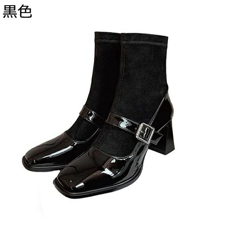 ショートブーツ ソックスブーツ レディース ブーティ ハイヒール8cm 太ヒール エナメル メリージ・・・
