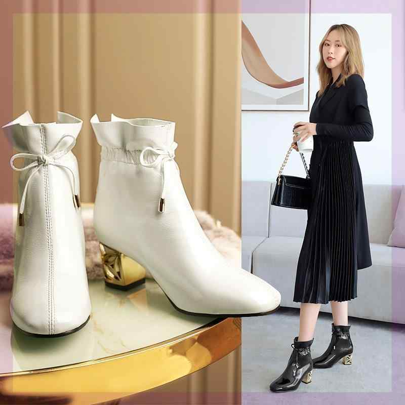ショートブーツ レディース ブーティー 太ヒール ブロックヒール エナメル パテントレザー ストレッ・・・