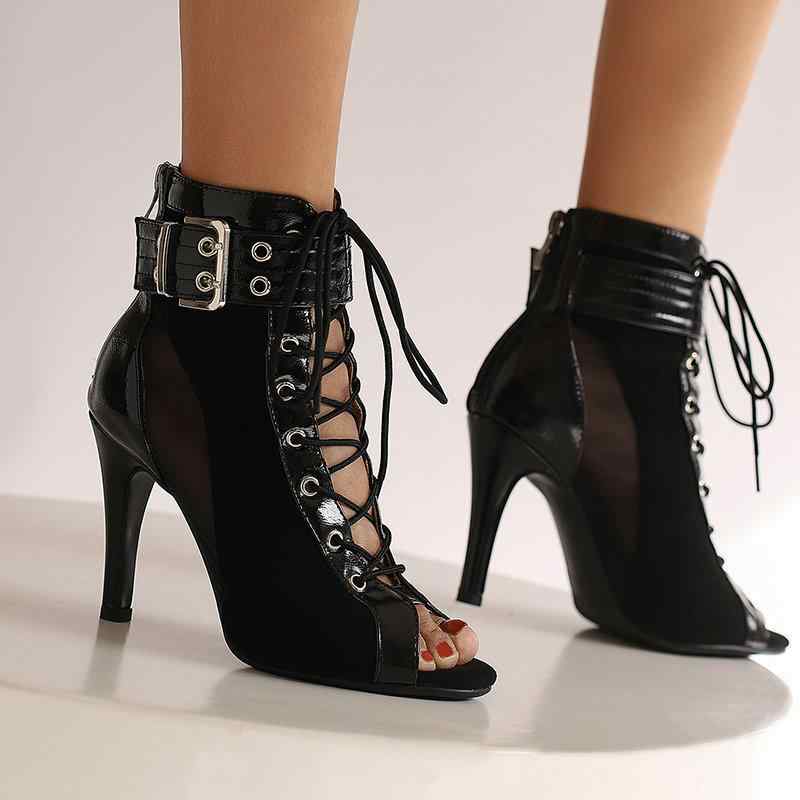 ブーツサンダル レディース ジャズダンスシューズ 細ヒール ハイヒール オープントゥ レースアップ ・・・
