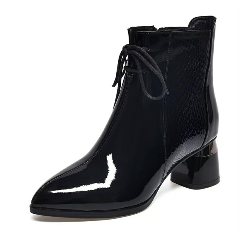 エナメル ショートブーツ レディース ブーツ 本革 太ヒール 4cm ブーティー ブーツ バックリボ・・・