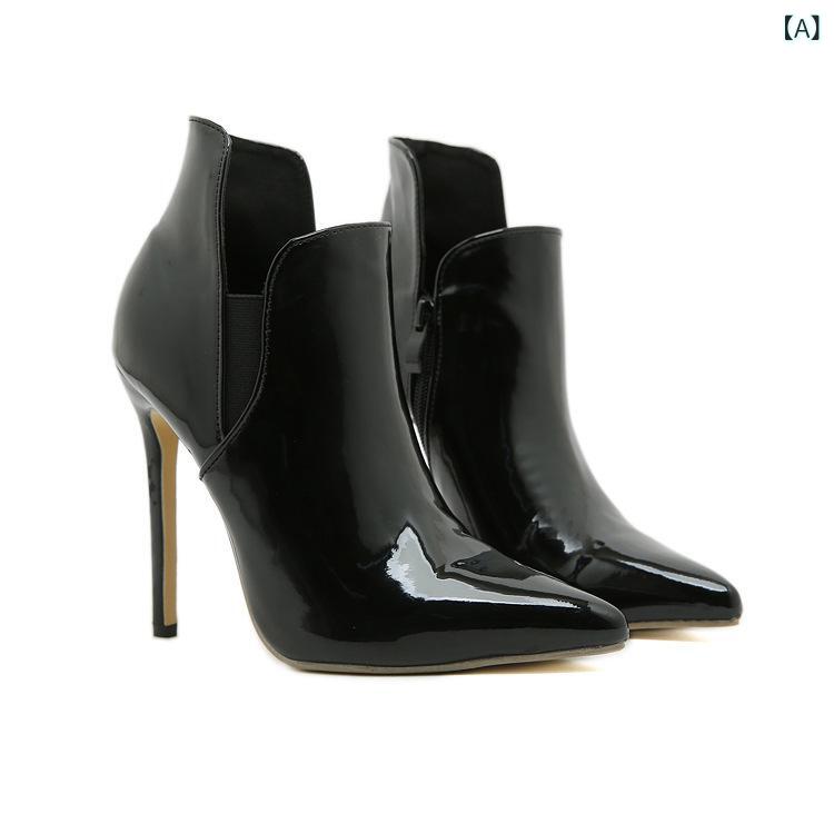 ショートブーツ レディース ブラック エナメル ポインテッドトゥ ハイヒール ピンヒール アンクル丈・・・