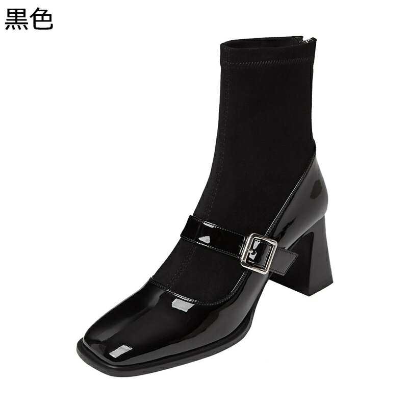 ブーティ ソックスブーツ レディース ショートブーツ ハイヒール8cm 粗いかかと エナメル メリー・・・
