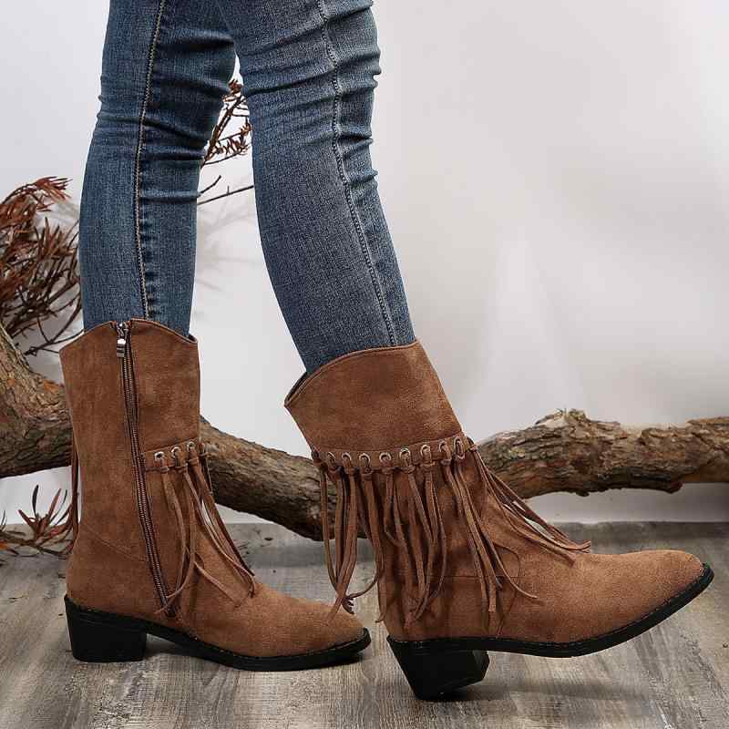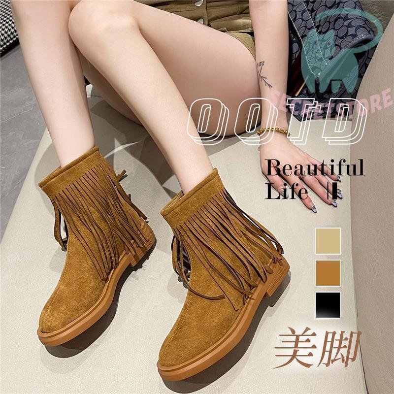 靴 レディース 大きいサイズ ゆったり 幅広 フリンジ ショートブーツ ブーティ ラウンドトゥ 太ヒ・・・