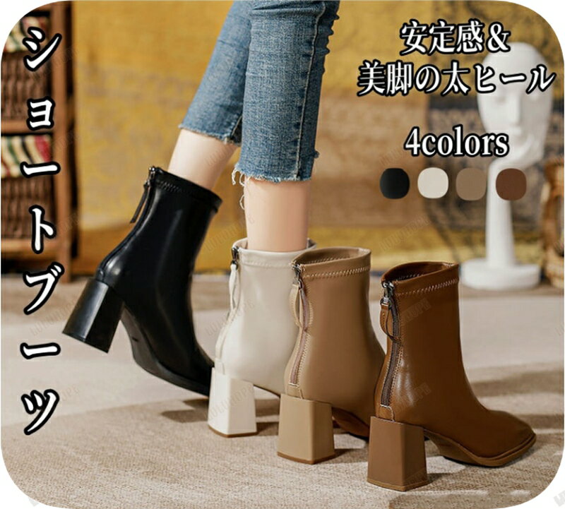 ブーツ レディース ショートブーツ 太ヒール ブーティー スクエアトゥ PUブーツ ハイヒールブーツ・・・