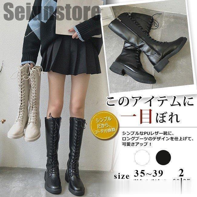 ロングブーツ レディース レースアップロングブーツ 編み上げ ロング丈 ローヒール 美脚 カジュアル・・・