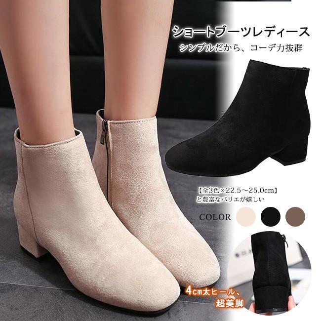 ショートブーツ レディース 太ヒール ショート丈 スクエアトゥ ブーティ シンプル 無地 スエード調・・・