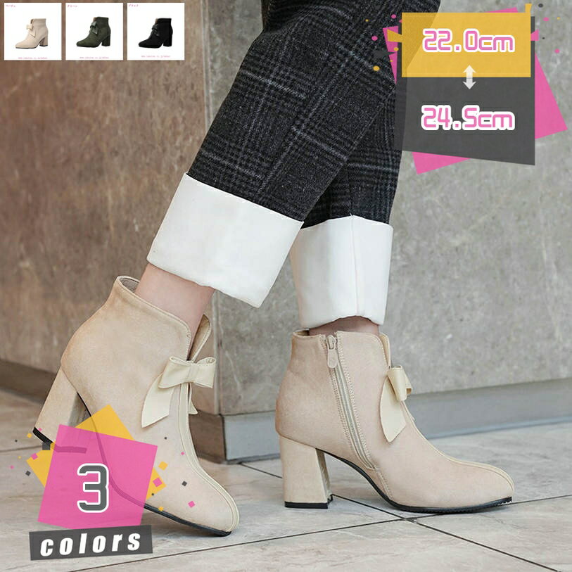 ショートブーツ レディース 太ヒール サイドジップ ラウンドトゥ リボン ブーティ 秋冬 大きいサイ・・・