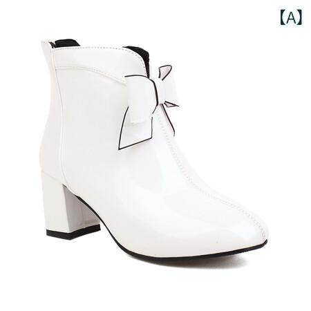 ショートブーツ レディース 太ヒール チャンキーヒール リボン サイドジップ ラウンドトゥ フェイク・・・