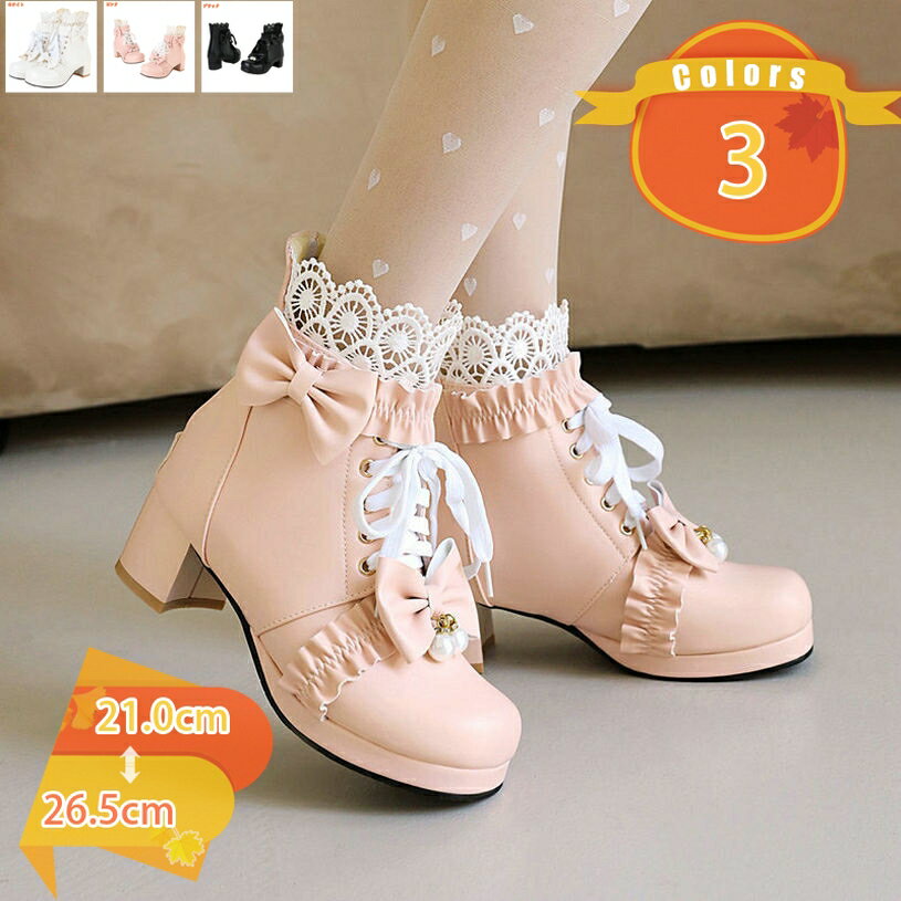 777円OFFクーポン 21.0CM-26.5CM 編み上げ ショートブーツ レディース リボン付き・・・