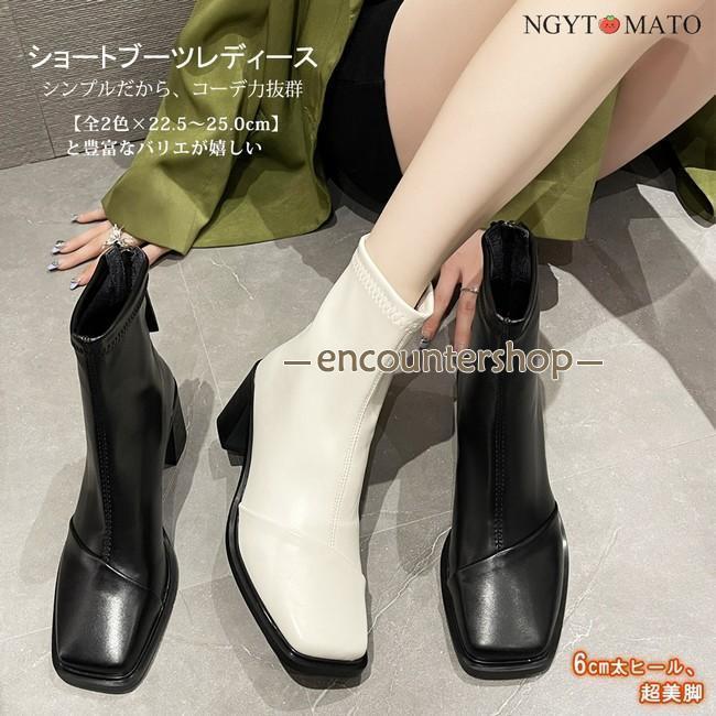 ショートブーツ ショート丈 レディース スクエアトゥ PU 黒 白 ブーツ チャンキーヒール 履きや・・・