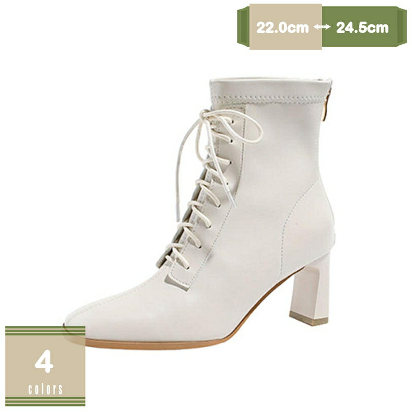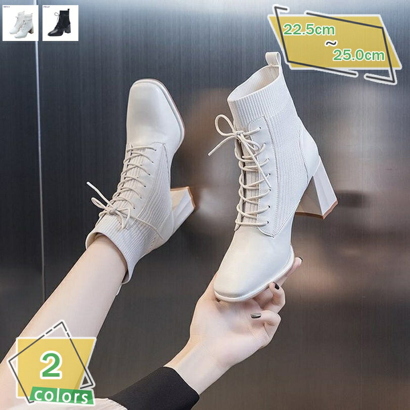 500円OFFクーポン ショートブーツ 黒 白 ハイヒール 7cm ニット レースアップ レディース・・・