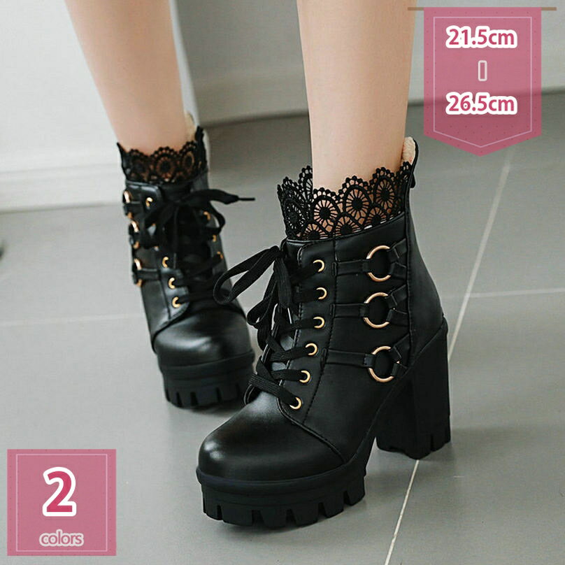1000円OFFクーポン 編み上げ 厚底ソール ハイヒール プラットフォーム ショートブーツ ブーテ・・・