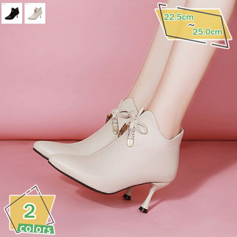 500円OFFクーポン ショートブーツ ピンヒール 蝶結び ビジュー ポインテッドトゥ ブーツ ヒー・・・