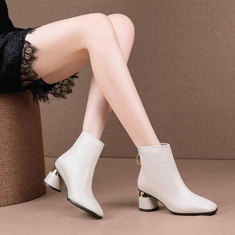 ショートブーツ レディース 本革 スクエアトゥ 太ヒール ミドルヒール 白 シンプル チャンキーヒー・・・