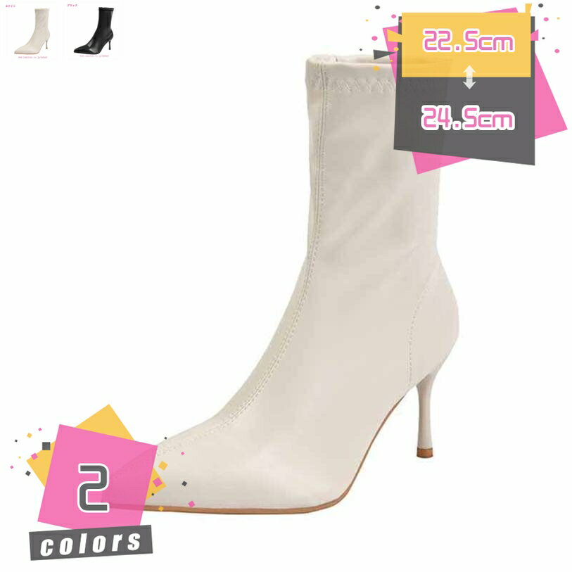 ショートブーツ ブーティ ブーティー ピンヒール ポインテッドトゥ 黒 白 サイドジップ スムース調・・・