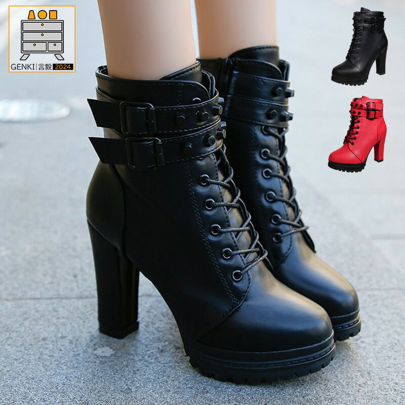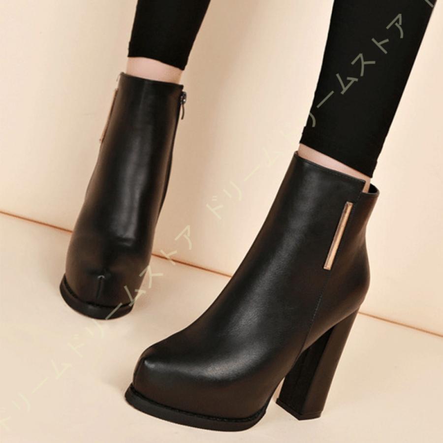 11cm 厚底ブーツ ショートブーツ 黒 レディース 無地ブーツ オフィスブーツ チャンキーヒール ・・・