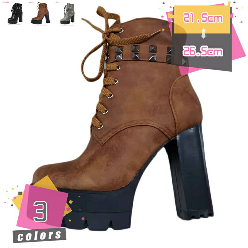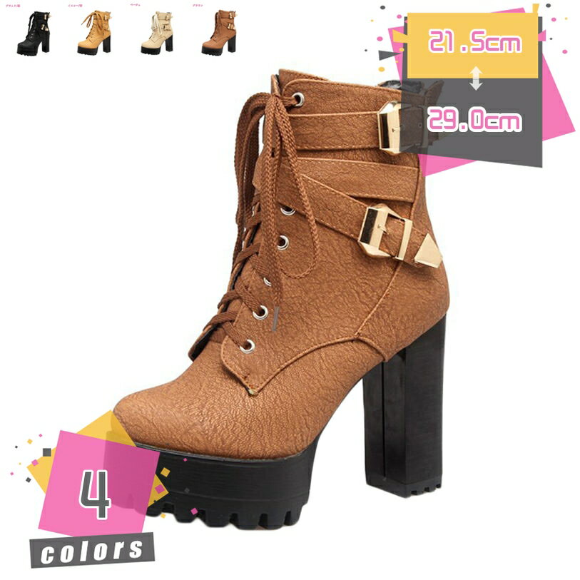1000円OFFクーポン レースアップ ラウンドトゥ ショートブーツ ヒール 編み上げ 美脚 ミドル・・・