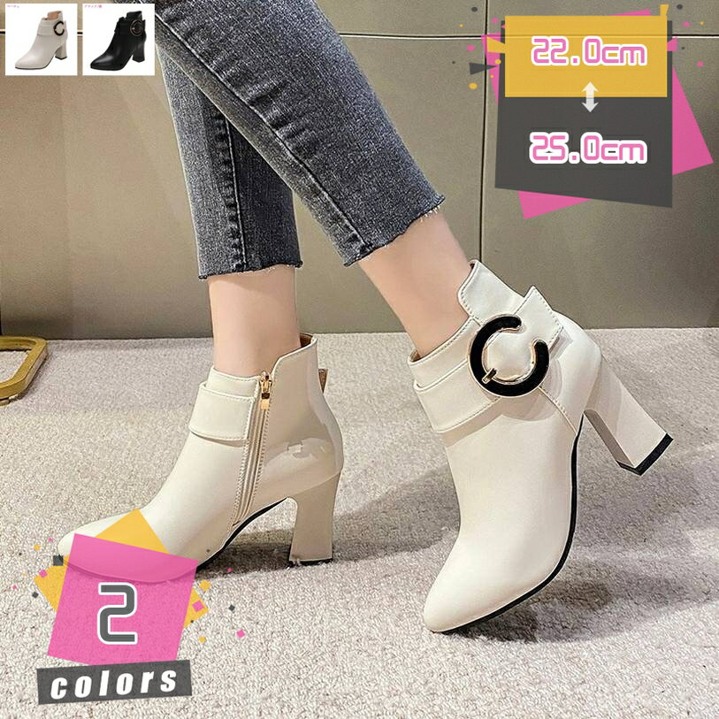 ショートブーツ ヒール8cm台 サイドジップ ブーツ ポインテッドトゥ ショート レディース 太めヒ・・・