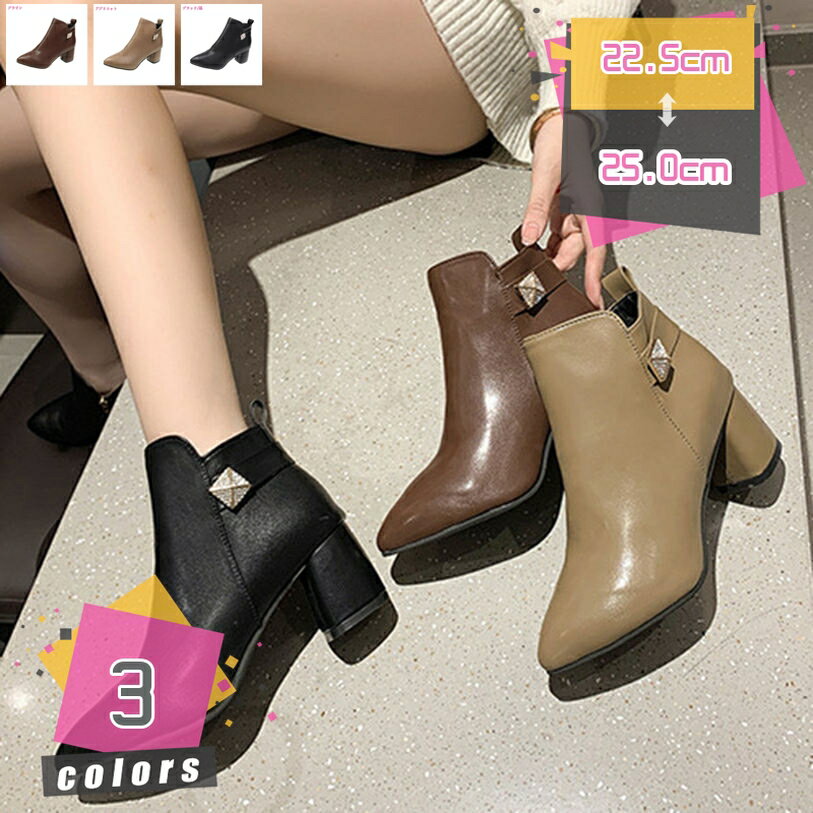 ポインテッドトゥショートブーツ レディース ハイヒール サイドジップ 太ヒール 歩きやすい 美脚 ブ・・・