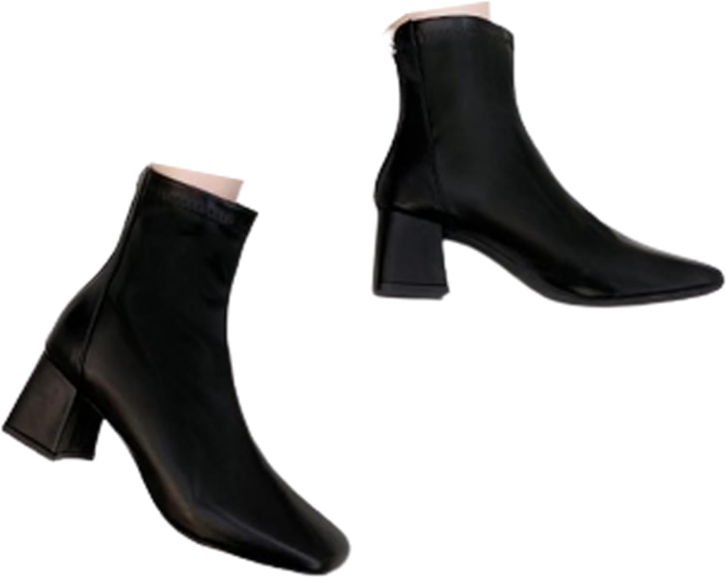 ショートブーツ レディース PUレザー スクエアトゥ 粗いかかと ブーティ ハイヒール 撥水 ジップ・・・