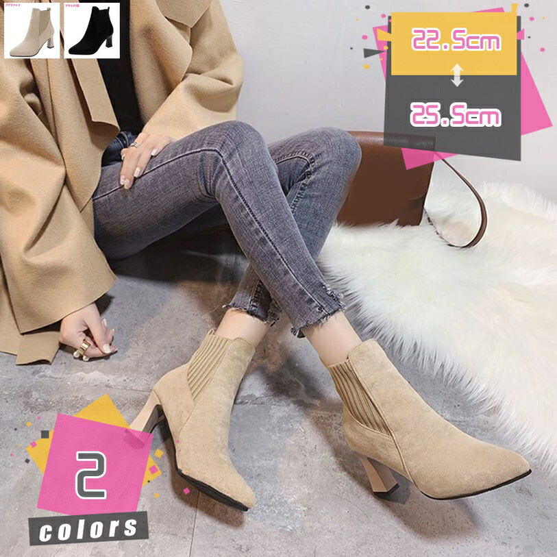 アンクルブーツ ポインテッドトゥ スエード 太ヒール ハイヒール レディース 柔らか ストレッチブー・・・