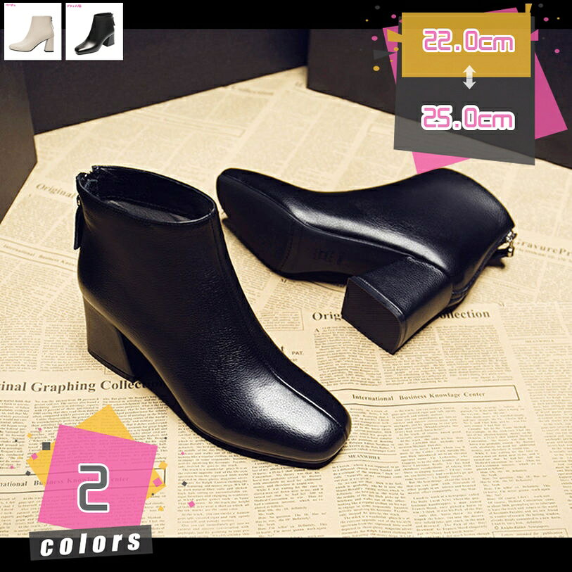 歩きやすい 美脚 ショートブーツ レディース スクエアトゥ レザー調 PU ブーツ バックジップ ミ・・・