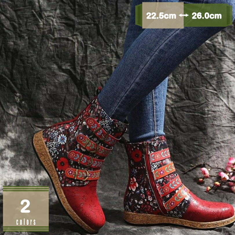ショートブーツ レディース 靴 Vカット 民族風 柄 歩きやすい ヒール チャンキーヒール 痛くない・・・