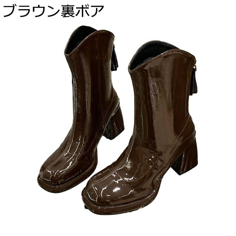 ショートブーツ ブーティ ハイヒール8cm レディースブーツ エナメル ジップアップ フェイクレザー・・・