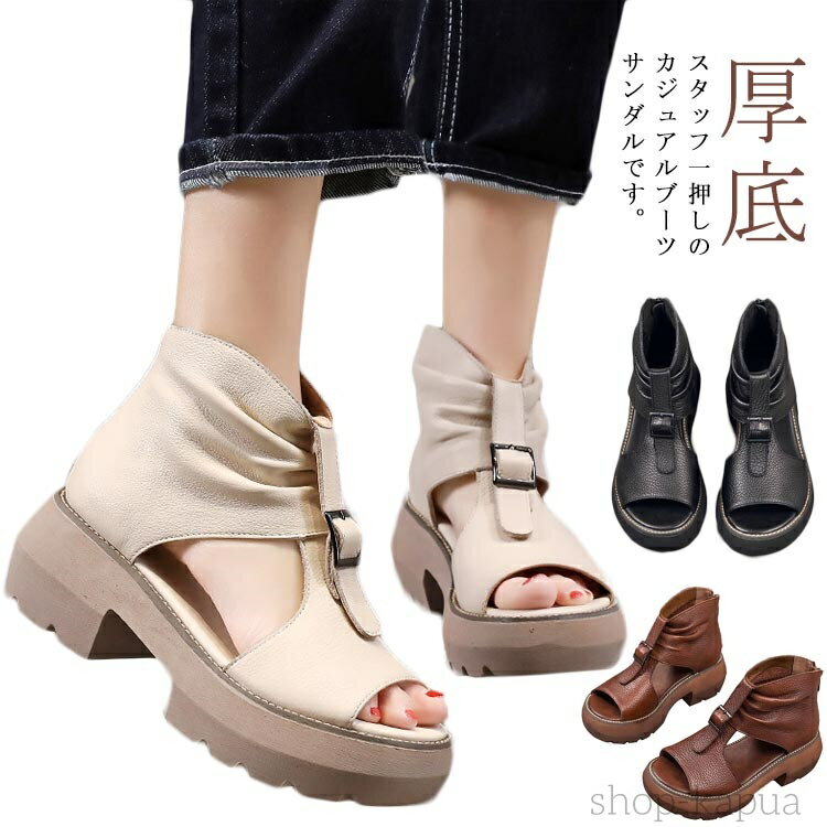 サマーブーツ ブーツサンダル レディース サマーブーツ ウェッジソール 靴 ショートブーツ 黒 フ・・・