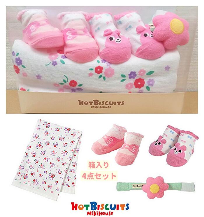 【ホットビスケッツ】ミキハウス ベビーギフト 小物セット ガーゼタオル ラトル 靴下【BOX付き】m・・・