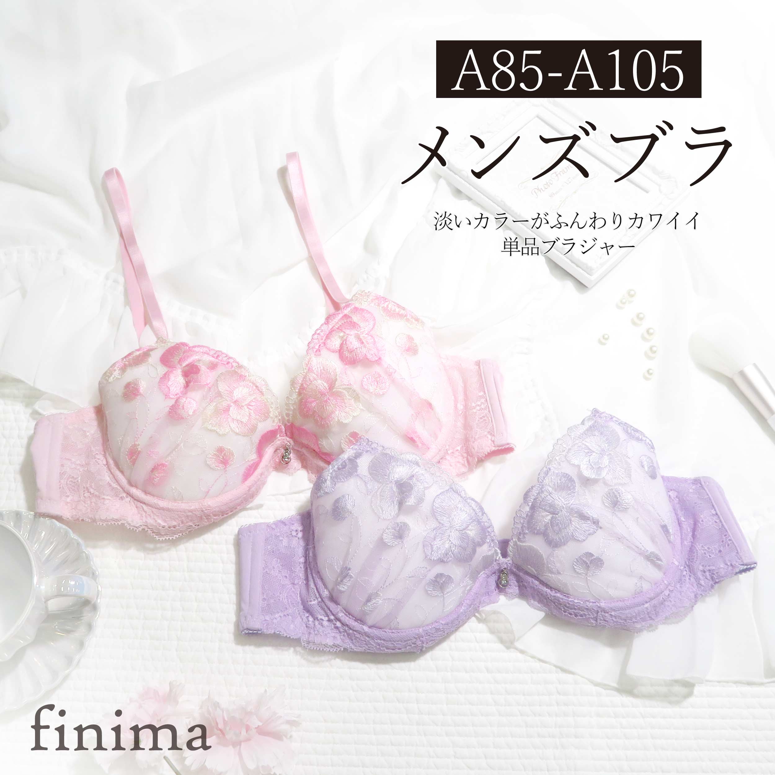 メンズブラジャー A85-A105 刺繍 清楚 乙女 ピンク パープル 男性用 パッド入り (JM-・・・