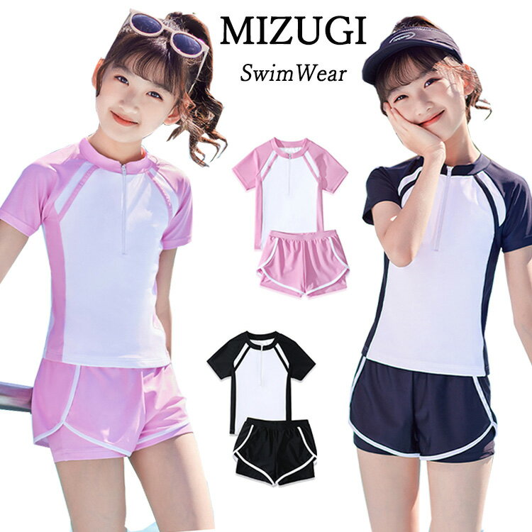 水着 キッズ 女の子 小学生 中学生 子供 半袖 ラッシュガード 無地 トップス パンツ セットアッ・・・