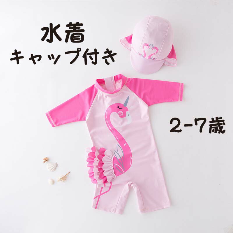 水着 女の子 半袖 ラッシュガード UV ロンパース キャップ付き 帽子付き フラミンゴ 2-7歳 ・・・