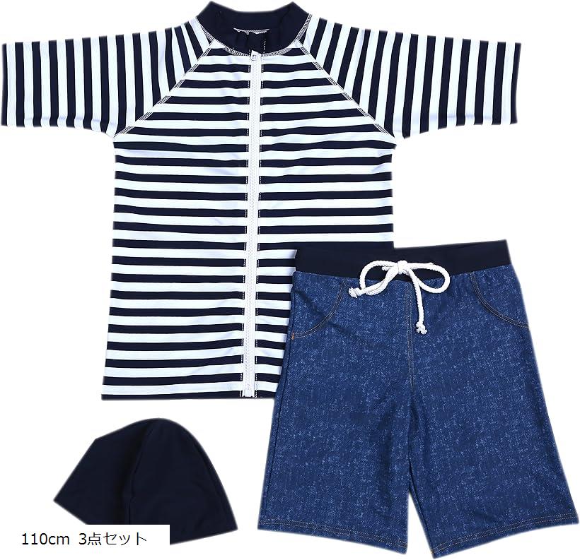 男の子 水着 UPF50+ ボーダー柄 ラッシュガード 帽子 デニム柄 パンツ 80~120cm 3・・・