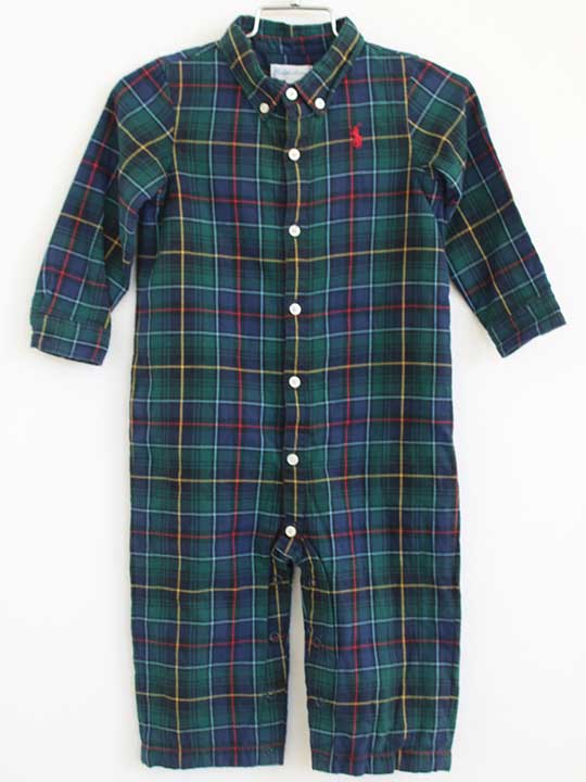 ラルフローレン シャツオール カバーオール 80cm キッズ 男児 緑×紺【中古】【新入荷!】†