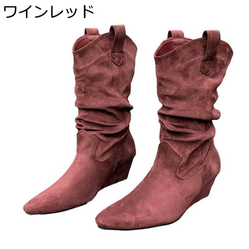 ロングブーツ レディース くしゅくしゅ インヒール 7cmアップ ミドル丈 美脚 秋冬春 大人 幅広・・・