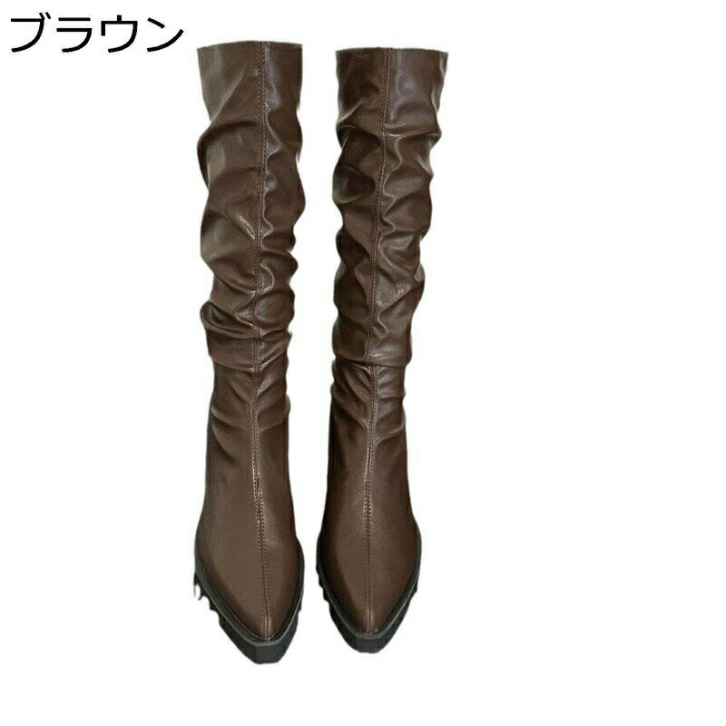 ロングブーツ レディース ジョッキーブーツ PU 膝高 インヒール 4.5cm ポインテッドトゥ く・・・