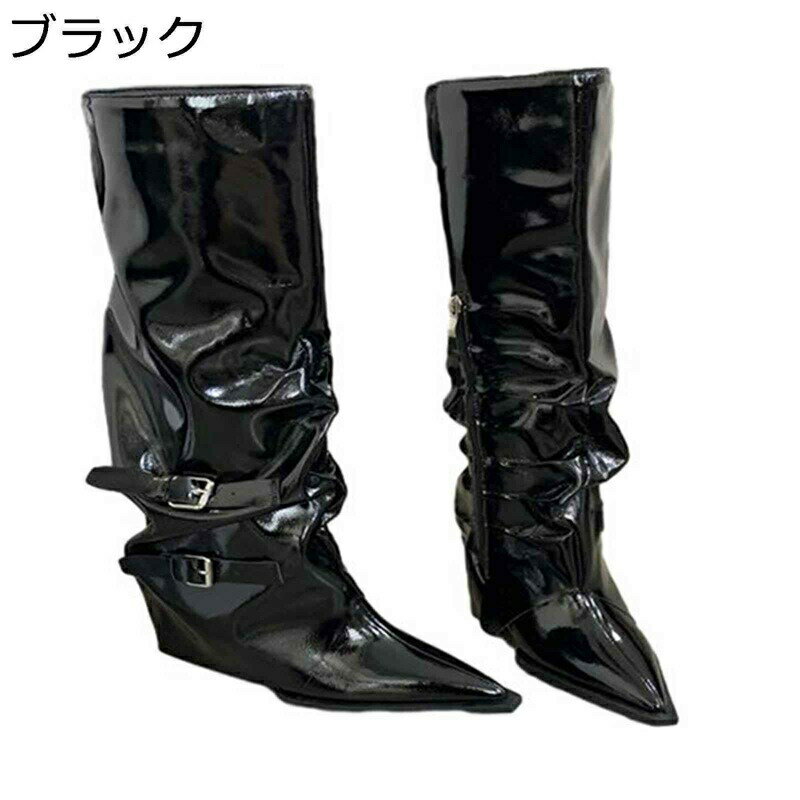 ひざ丈 ロングブーツ レディース 袴ブーツ くしゅくしゅ ピンヒール8cm バックル ポインテッドト・・・