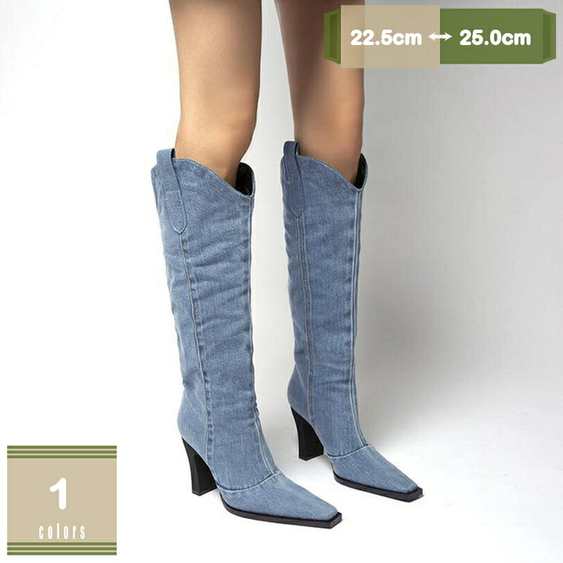 デニムブーツ くしゅくしゅ ポインテッドトゥ ニーハイブーツ ロングブーツ ハイヒール7cm レディ・・・
