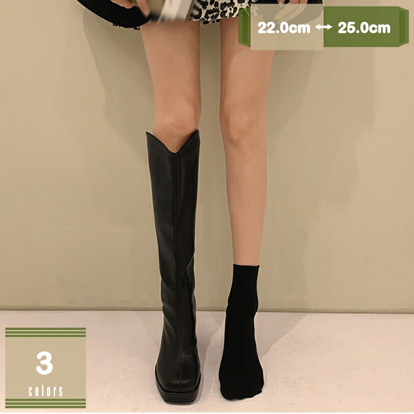 レディース ロング ブーツ ニーハイブーツ 太ヒール スクエアヒール 11cm ゆったり 高筒ブーツ・・・