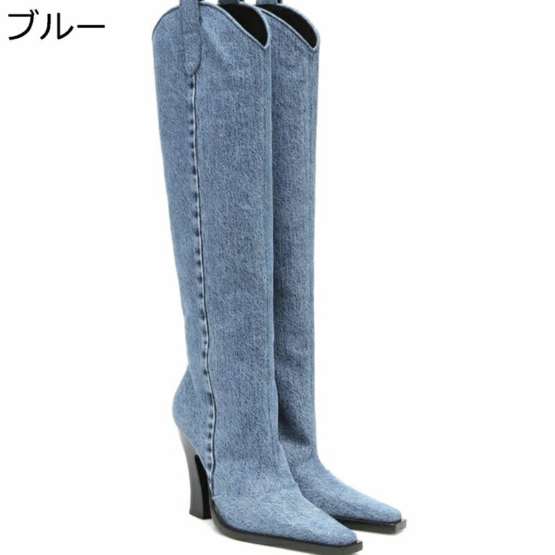 ロングブーツ デニムブーツ ハイヒール レディース ポインテッドトゥ ウェスターブーツ Vカット セ・・・