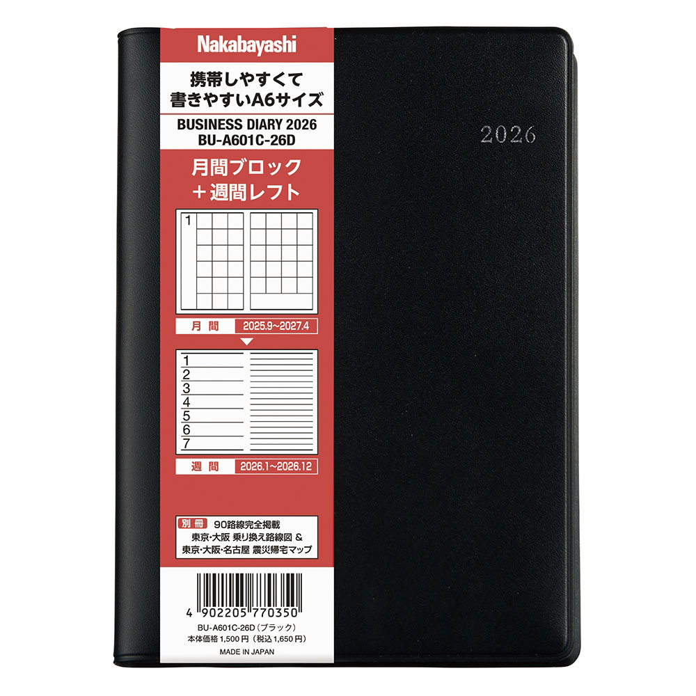 【ナカバヤシ】ビジネスダイアリー2026 月別レフト/A6/ブラック手帳 ダイアリー 仕事