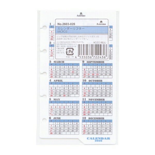 2026年 マイクロ5穴サイズ カレンダーリフター【ホワイト】システム手帳リフィル