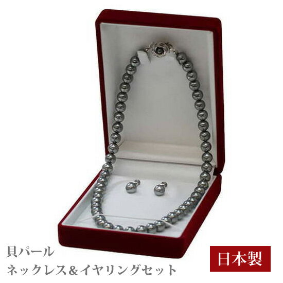 Pure 日本製 貝パール ネックレス&イヤリングセット 8mm玉 グレー 39cm 花カン 慶弔兼・・・
