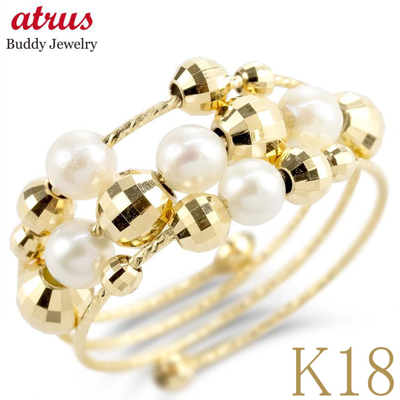 18金 リング レディース フリーサイズ 3連 アコヤ真珠 パール ミラーボール デザイン 指輪 K・・・