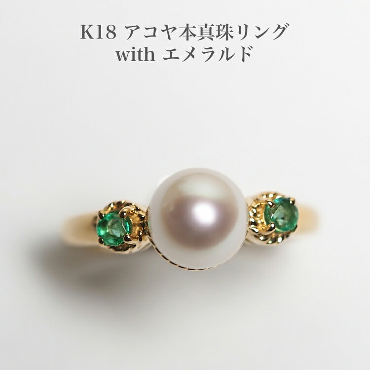 K18 アコヤ本真珠 リング 天然エメラルド付き 11号 サイズ直し可 あこやパール 指輪 18金イ・・・
